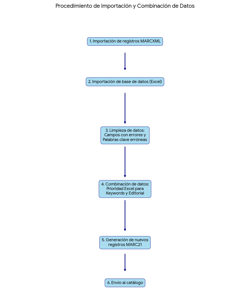 Combinación Inteligente: Se realiza el cruce de datos. En este paso, se aplica la regla de negocio donde la información de palabras clave y editorial proveniente del Excel tiene prioridad absoluta (se toma como fuente de verdad) sobre la del registro MARCXML.